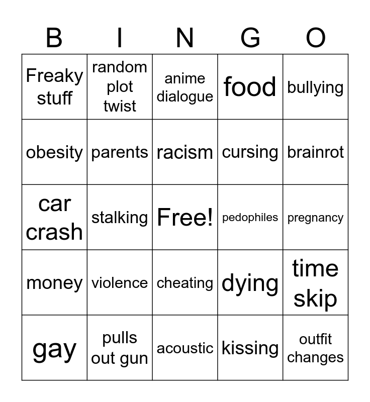 This bingo card has a free space and 24 words: violence, pulls out gun, racism, gay, bullying, Freaky stuff, obesity, random plot twist, pedophiles, cheating, cursing, car crash, dying, time skip, parents, kissing, pregnancy, anime dialogue, brainrot, stalking, outfit changes, money, food and acoustic.