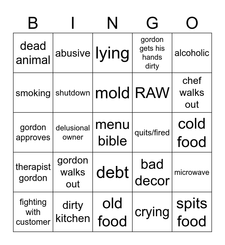 This bingo card has a free space and 24 words: gordon walks out, dirty kitchen, mold, fighting with customer, alcoholic, dead animal, smoking, abusive, quits/fired, debt, RAW, gordon approves, bad decor, microwave, shutdown, crying, cold food, lying, chef walks out, delusional owner, spits food, therapist gordon, gordon gets his hands dirty and old food.
