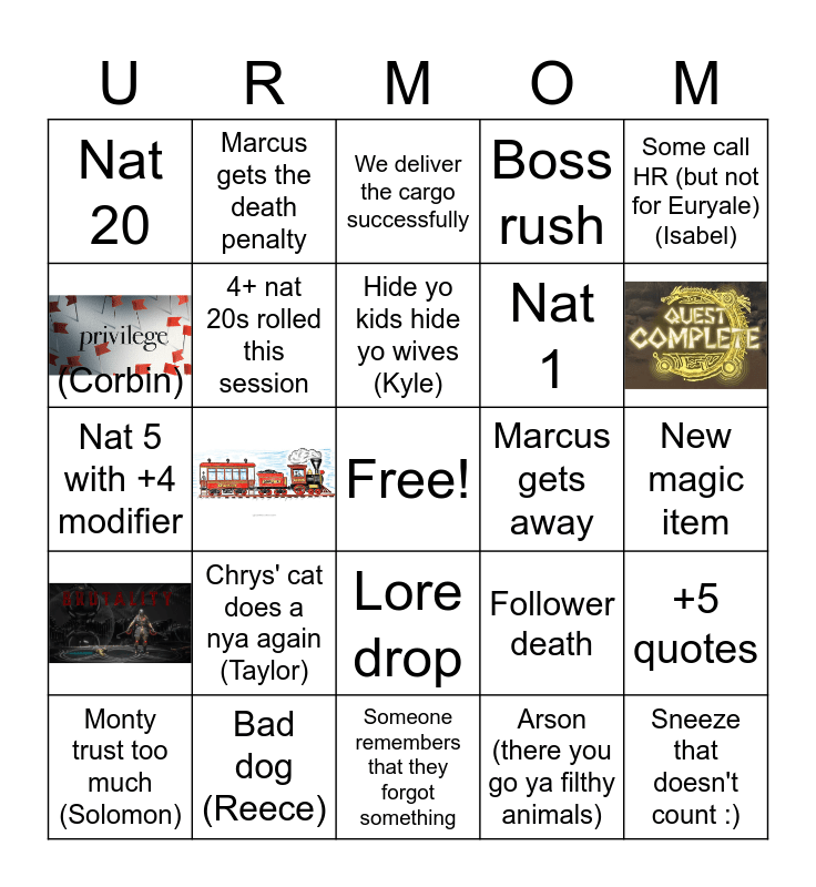 This bingo card has 4 images, a free space and 21 words: Chrys' cat does a nya again (Taylor), Bad dog (Reece), Hide yo kids hide yo wives (Kyle), Monty trust too much (Solomon), Some call HR (but not for Euryale) (Isabel), Nat 20, (Corbin), Marcus gets the death penalty, Marcus gets away, Lore drop, Nat 1, Nat 5 with +4 modifier, Follower death, +5 quotes, 4+ nat 20s rolled this session, Arson (there you go ya filthy animals), New magic item, We deliver the cargo successfully, Sneeze that doesn't count :), Boss rush and Someone remembers that they forgot something.