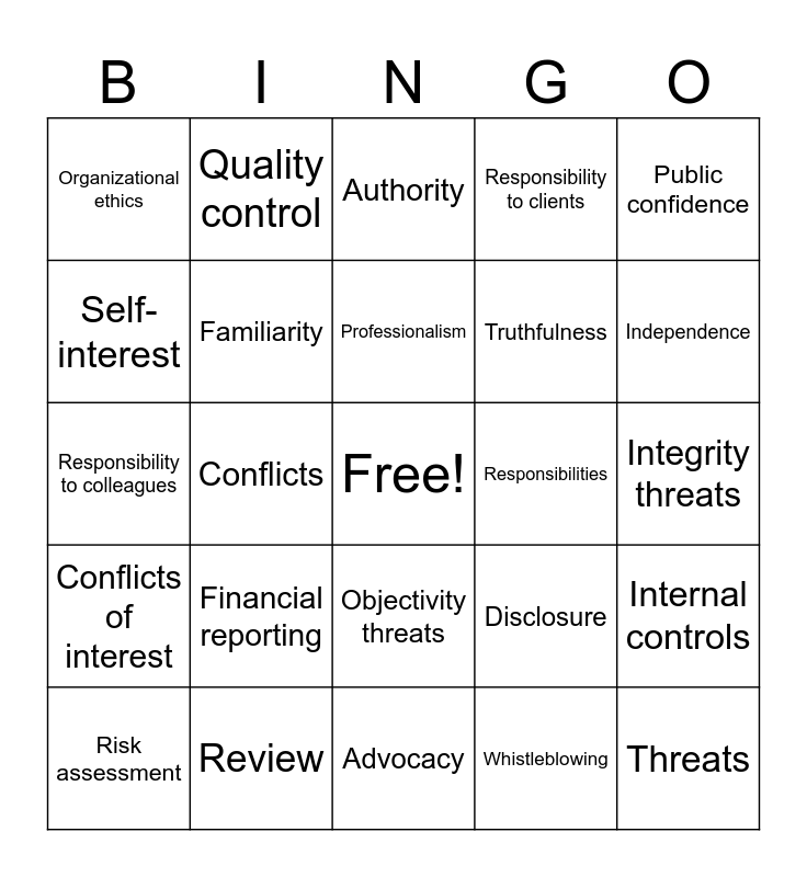 This bingo card has a free space and 75 words: Assurance, Compliance framework, Authority, Decision-making, Transparency, Trust, Public interest, Safeguards, Self-review, Noncompliance, Client relationships, Misrepresentation, Professionalism, Self-interest, Due care, Conflicts, Consultation, Threats, Competence, Public confidence, Accuracy, Responsibility to colleagues, Familiarity, Quality control, Responsibility to clients, Fiduciary duty, Standards, Credibility, Safeguarding, Objectivity, Quality, Ethics, Rules, Disclosure, Independence, Truthfulness, Professional judgment, Audit, Integrity threats, Whistleblowing, Independence in appearance, Reporting obligations, Peer review, Compliance, Service, Enforcement, Risk assessment, Organizational ethics, Integrity, Conduct, Fraud prevention, Objectivity threats, Undue influence, Accounting principles, Governance, Confidentiality, Non-attest services, Disciplinary, Enforcement actions, Record retention, Financial reporting, Accountancy, Leadership, Scope of services, Diligence, Responsibilities, Fairness, Due professional care, Independence in fact, Internal controls, Conflicts of interest, Review, Judgment, Advocacy and Professional skepticism.