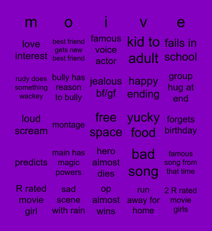 This bingo card has a free space and 34 words: explosion, run away for home, dream, moving away, predicts, bully has reason to bully, fails in school, R rated movie girl, best friend gets new best friend, 4th wall break, jealous bf/gf, famous voice actor, villain doesn't die, cringe scene, yucky food, group hug at end, sad scene with rain, loud scream, main has magic powers, bad song, hero almost dies, wins against op, love interest, forgets birthday, op almost wins, 2 R rated movie girls, kid to adult, main saves kid, happy ending, rudy does something wackey, friends are dumb, montage, famous song from that time and death of family member.