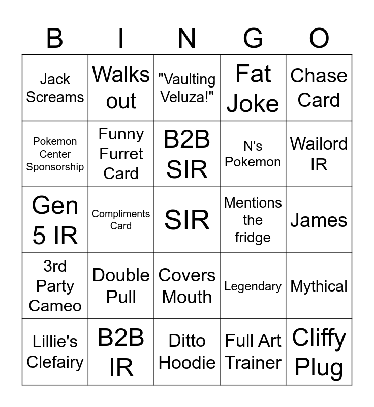 This bingo card has a free space and 24 words: Double Pull, B2B IR, B2B SIR, Lillie's Clefairy, Chase Card, Jack Screams, Pokemon Center Sponsorship, Walks out, Mentions the fridge, Covers Mouth, N's Pokemon, Gen 5 IR, Legendary, Mythical, Funny Furret Card, Full Art Trainer, James, "Vaulting Veluza!", Wailord IR, Compliments Card, Cliffy Plug, 3rd Party Cameo, Fat Joke and Ditto Hoodie.