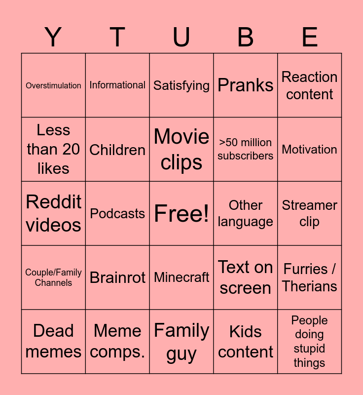 This bingo card has a free space and 25 words: Brainrot, Family guy, Movie clips, Dead memes, Reaction content, Overstimulation, Less than 20 likes, Informational, Other language, Minecraft, >50 million subscribers, Reddit videos, Text on screen, Furries / Therians, Children, POV, Streamer clip, Satisfying, Motivation, Podcasts, People doing stupid things, Meme comps., Couple/Family Channels, Pranks and Kids content.