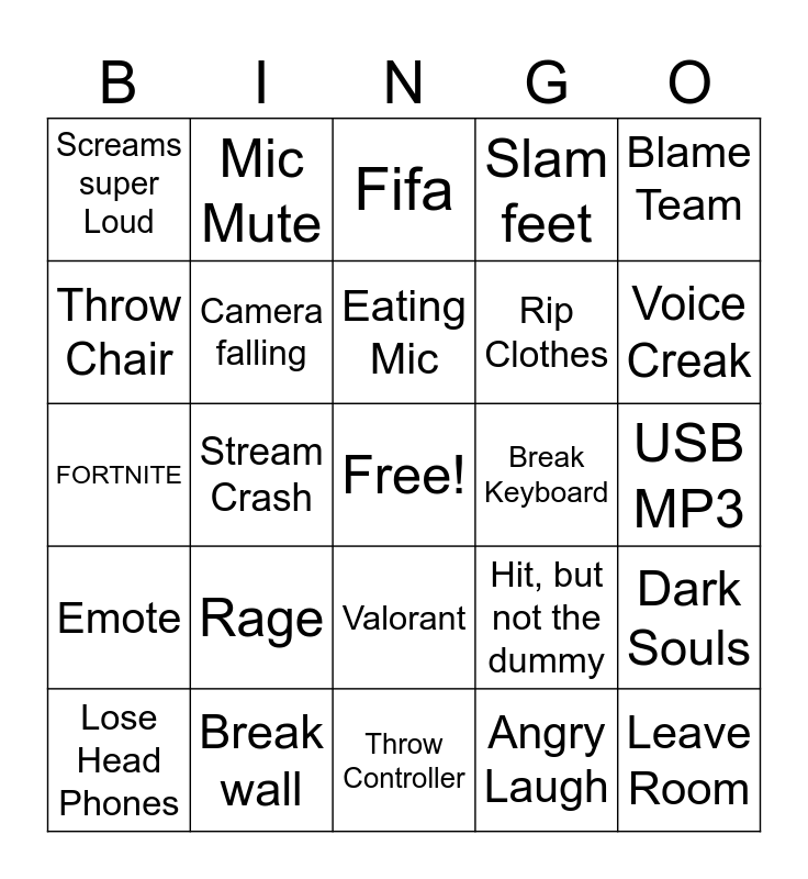 This bingo card has a free space and 24 words: Lose Head Phones, Rage, Eating Mic, Angry Laugh, Blame Team, Screams super Loud, Mic Mute, Fifa, Break Keyboard, USB MP3, FORTNITE, Camera falling, Hit, but not the dummy, Dark Souls, Throw Chair, Break wall, Throw Controller, Slam feet, Voice Creak, Emote, Stream Crash, Valorant, Rip Clothes and Leave Room.