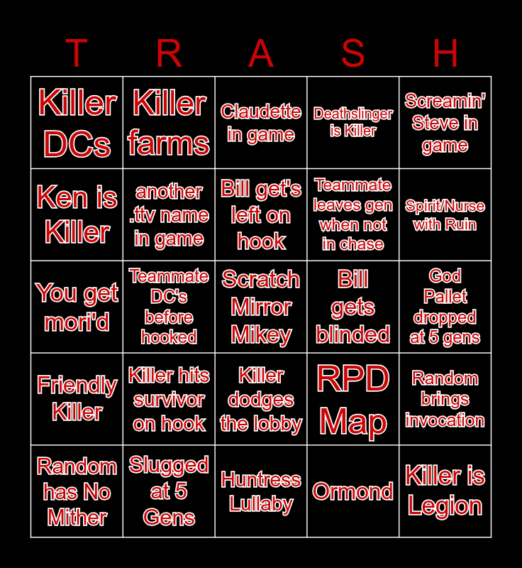This bingo card has a free space and 30 words: Slugged at 5 Gens, Killer is Clown, Teammate DC's before hooked, Face-Camped, Killer DCs, Claudette in game, another .ttv name in game, Killer dodges the lobby, Bill gets blinded, Huntress Lullaby, God Pallet dropped at 5 gens, Killer is Legion, Ormond, Killer tunnels, Spirit/Nurse with Ruin, Hit with NOED, RPD Map, Friendly Killer, Killer hits survivor on hook, Screamin' Steve in game, You get mori'd, You get sandbaged by teammate, Killer farms, Teammate leaves gen when not in chase, Ken is Killer, Deathslinger is Killer, Random brings invocation, Random has No Mither, Bill get's left on hook and Pain Res.