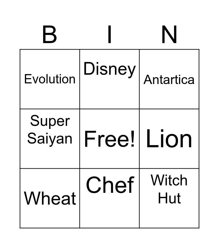 This bingo card has a free space and 8 words: Lion, Antartica, Disney, Wheat, Evolution, Witch Hut, Super Saiyan and Chef.