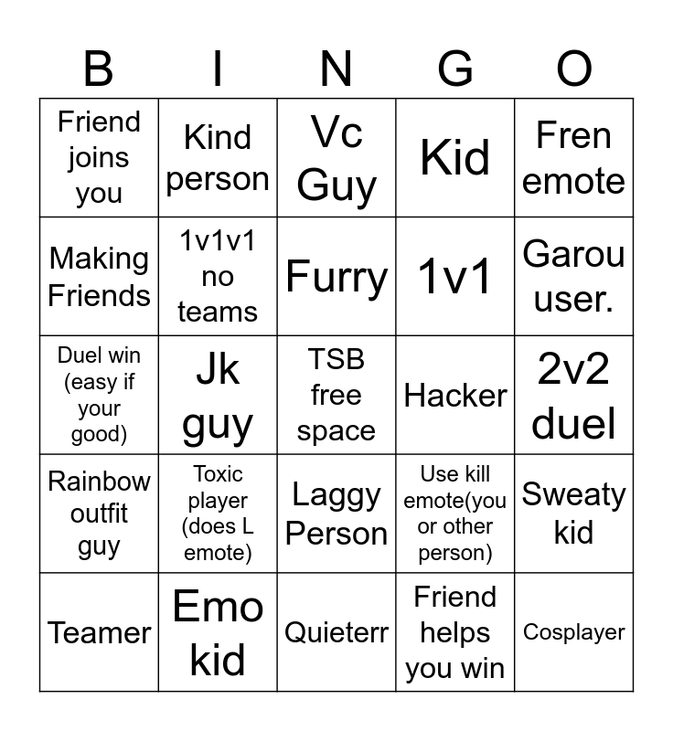 This bingo card has a free space and 24 words: Toxic player (does L emote), Emo kid, Furry, Teamer, Fren emote, Friend joins you, Making Friends, Kind person, Hacker, Laggy Person, 1v1, Duel win (easy if your good), Use kill emote(you or other person), Sweaty kid, 1v1v1 no teams, Friend helps you win, 2v2 duel, Vc Guy, Garou user., Jk guy, Cosplayer, Rainbow outfit guy, Kid and Quieterr.