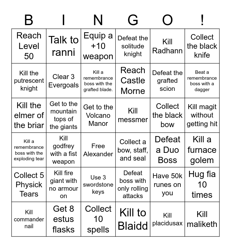 This bingo card has 36 words: Defeat boss with only rolling attacks, Use 3 swordstone keys, Kill to Blaidd, Kill the putrescent knight, Kill a remembrance boss with the exploding tear, Kill messmer, Clear 3 Evergoals, Collect 10 spells, Kill Radhann, Have 50k runes on you, Beat a remembrance boss with a dagger, Defeat the solitude knight, Hug fia 10 times, Get to the mountain tops of the giants, Reach Castle Morne, Reach Level 50, Collect 5 Physick Tears, Collect the black bow, Kill the elmer of the briar, Equip a +10 weapon, Get to the Volcano Manor, Kill godfrey with a fist weapon, Collect a bow, staff, and seal, Free Alexander, Defeat a Duo Boss, Talk to ranni, Defeat the grafted scion, Get 8 estus flasks, Kill a remembrance boss with the grafted blade., Collect the black knife, Kill maliketh, Kill commander nail, Kill a furnace golem, Kill magit without getting hit, Kill fire giant with no armour on and Kill placidusax.
