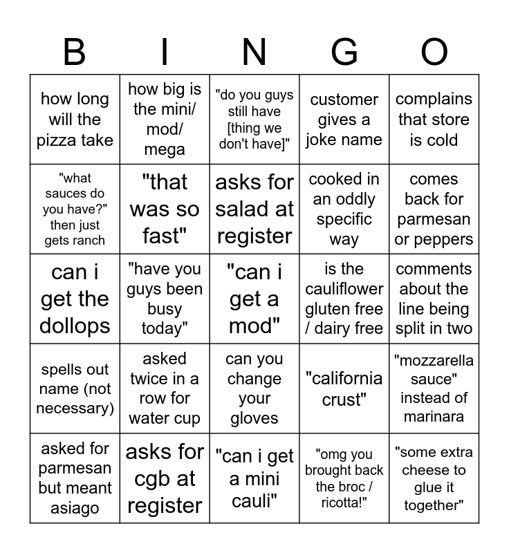 This bingo card has a free space and 24 words: asked twice in a row for water cup, asks for cgb at register, asks for salad at register, asked for parmesan but meant asiago, complains that store is cold, how long will the pizza take, "what sauces do you have?" then just gets ranch, how big is the mini/ mod/ mega, is the cauliflower gluten free / dairy free, can you change your gloves, cooked in an oddly specific way, can i get the dollops, "california crust", "mozzarella sauce" instead of marinara, "that was so fast", "omg you brought back the broc / ricotta!", comments about the line being split in two, "do you guys still have [thing we don't have]", comes back for parmesan or peppers, "have you guys been busy today", "some extra cheese to glue it together", spells out name (not necessary), customer gives a joke name and "can i get a mini cauli".