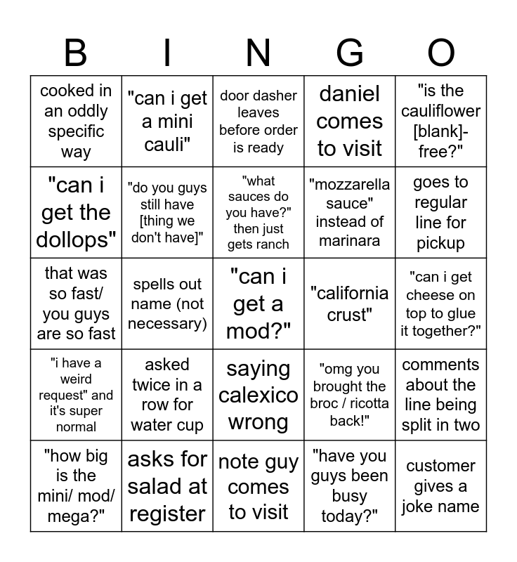 This bingo card has a free space and 24 words: asked twice in a row for water cup, asks for salad at register, "what sauces do you have?" then just gets ranch, "how big is the mini/ mod/ mega?", "is the cauliflower [blank]-free?", cooked in an oddly specific way, "can i get the dollops", "can i get a mini cauli", "california crust", saying calexico wrong, "mozzarella sauce" instead of marinara, that was so fast/ you guys are so fast, "omg you brought the broc / ricotta back!", comments about the line being split in two, "do you guys still have [thing we don't have]", "have you guys been busy today?", "can i get cheese on top to glue it together?", door dasher leaves before order is ready, goes to regular line for pickup, spells out name (not necessary), customer gives a joke name, "i have a weird request" and it's super normal, daniel comes to visit and note guy comes to visit.