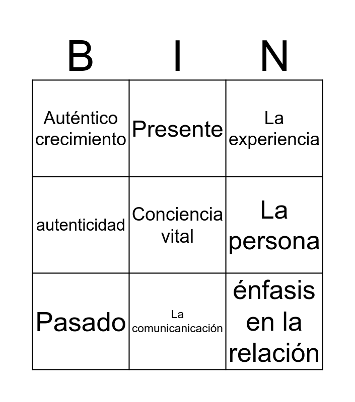 This bingo card has a free space and 8 words: La persona, La experiencia, Presente, Pasado, Auténtico crecimiento, énfasis en la relación, autenticidad and La comunicanicación.