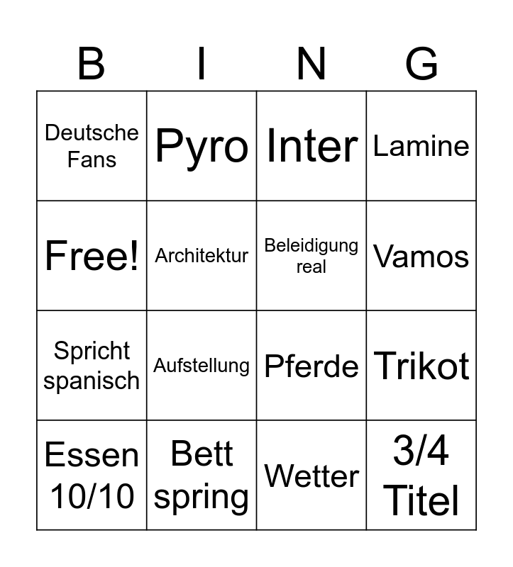 This bingo card has 16 words: Bett spring, Trikot, Inter, Deutsche Fans, Spricht spanisch, Pyro, Pferde, Wetter, Free!, Architektur, Essen 10/10, Lamine, Aufstellung, Vamos, Beleidigung real and 3/4 Titel.