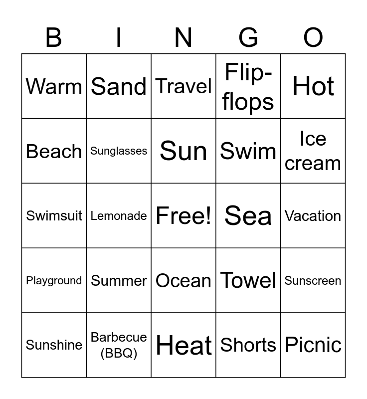 This bingo card has a free space and 25 words: Summer, Heat, Sun, Sunshine, Hot, Warm, Beach, Sand, Sea, Ocean, Swim, Swimsuit, Towel, Sunscreen, Sunglasses, Hat, Vacation, Travel, Ice cream, Lemonade, Picnic, Barbecue (BBQ), Playground, Flip-flops and Shorts.