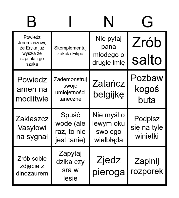 This bingo card has 16 words: Zapytaj dzika czy sra w lesie, Podpisz się na tyle winietki, Nie pytaj pana młodego o drugie imię, Powiedz Jeremiaszowi, że Eryka już wyszła ze szpitala i go szuka, Zaklaszcz Vasylowi na sygnał, Skomplementuj zakola Filipa, Nie myśl o lewym oku swojego wielbłąda, Zjedz pieroga, Powiedz amen na modlitwie, Zademonstruj swoje umiejętności taneczne, Zrób sobie zdjęcie z dinozaurem, Zrób salto, Spuść wodę (ale raz, to nie jest tanie), Pozbaw kogoś buta, Zatańcz belgijkę and Zapinij rozporek.