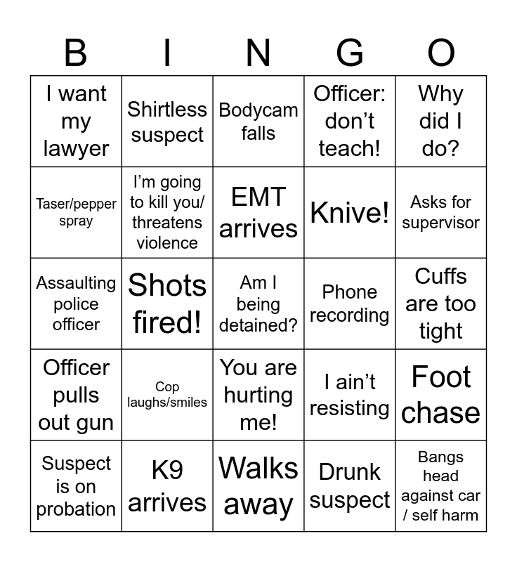 This bingo card has 25 words: Cop laughs/smiles, Walks away, EMT arrives, Suspect is on probation, Why did I do?, I want my lawyer, Taser/pepper spray, Shirtless suspect, Phone recording, You are hurting me!, Knive!, Assaulting police officer, I ain’t resisting, Foot chase, I’m going to kill you/ threatens violence, Bangs head against car / self harm, Cuffs are too tight, Bodycam falls, Asks for supervisor, Shots fired!, Am I being detained?, K9 arrives, Officer pulls out gun, Officer: don’t teach! and Drunk suspect.