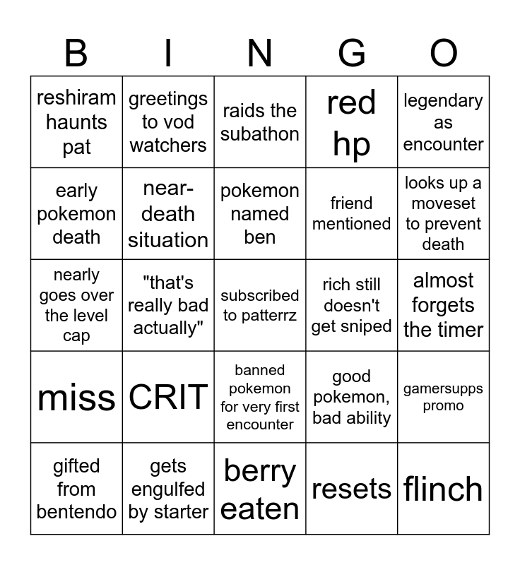 This bingo card has a free space and 24 words: CRIT, gets engulfed by starter, pokemon named ben, gifted from bentendo, legendary as encounter, reshiram haunts pat, early pokemon death, greetings to vod watchers, rich still doesn't get sniped, banned pokemon for very first encounter, friend mentioned, nearly goes over the level cap, good pokemon, bad ability, gamersupps promo, near-death situation, resets, almost forgets the timer, raids the subathon, looks up a moveset to prevent death, "that's really bad actually", flinch, miss, red hp and berry eaten.