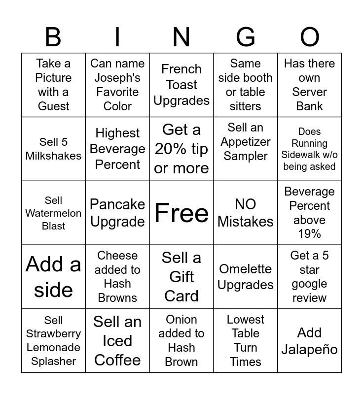 This bingo card has a free space and 24 words: Cheese added to Hash Browns, Sell an Iced Coffee, Get a 20% tip or more, Sell Strawberry Lemonade Splasher, Has there own Server Bank, Take a Picture with a Guest, Sell 5 Milkshakes, Can name Joseph's Favorite Color, NO Mistakes, Sell a Gift Card, Sell an Appetizer Sampler, Sell Watermelon Blast, Omelette Upgrades, Get a 5 star google review, Highest Beverage Percent, Lowest Table Turn Times, Beverage Percent above 19%, French Toast Upgrades, Does Running Sidewalk w/o being asked, Pancake Upgrade, Add Jalapeño, Add a side, Same side booth or table sitters and Onion added to Hash Brown.