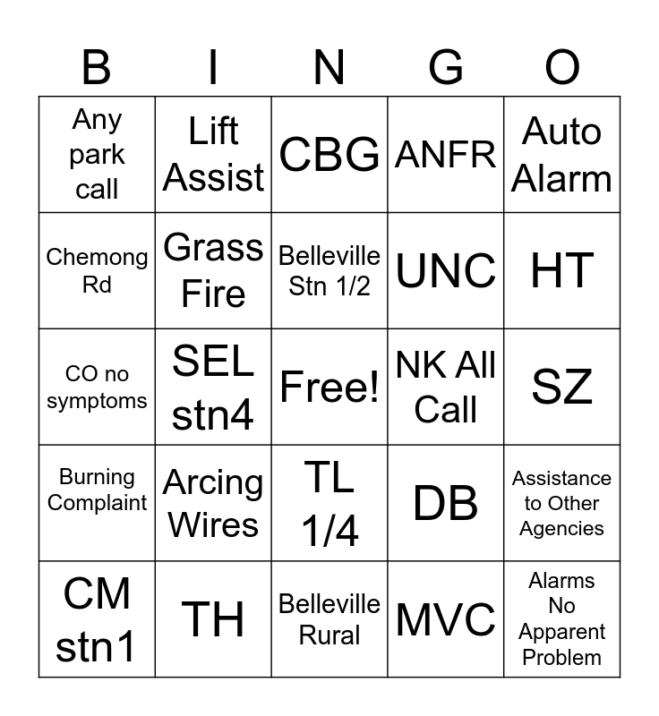 This bingo card has a free space and 32 words: MVC, DD stn1, SEL stn4, SEL stn2, Burning Complaint, Grass Fire, Auto Alarm, Assistance to Other Agencies, Lift Assist, PTBO stn2, Belleville Stn 1/2, CBG, 401E, Tim Hortons, NK All Call, BR all call, CM stn1, CO no symptoms, TL 1/4, Arcing Wires, DB, Chest Pain, SZ, TH, Alarms No Apparent Problem, ANFR, UNC, Chemong Rd, Any park call, Belleville Rural, Island Call and HT.