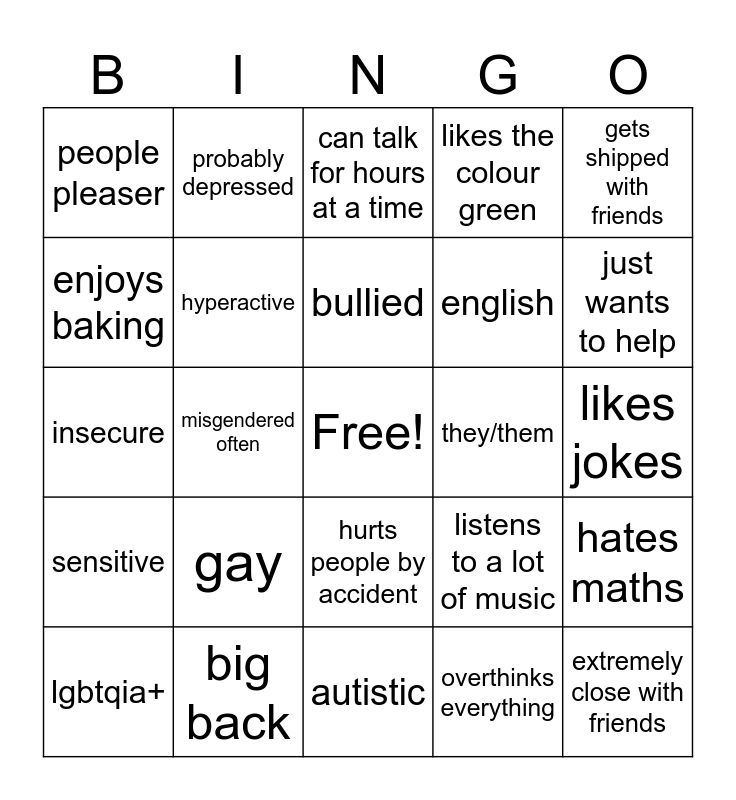 This bingo card has a free space and 24 words: gay, big back, bullied, lgbtqia+, gets shipped with friends, people pleaser, enjoys baking, probably depressed, they/them, hurts people by accident, english, insecure, listens to a lot of music, hates maths, hyperactive, overthinks everything, likes jokes, can talk for hours at a time, just wants to help, misgendered often, extremely close with friends, sensitive, likes the colour green and autistic.