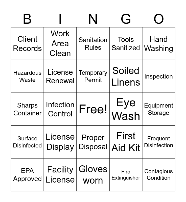 This bingo card has a free space and 24 words: License Display, Facility License, Temporary Permit, EPA Approved, Hand Washing, Client Records, Hazardous Waste, Work Area Clean, Eye Wash, Proper Disposal, Soiled Linens, Sharps Container, First Aid Kit, Frequent Disinfection, License Renewal, Fire Extinguisher, Equipment Storage, Sanitation Rules, Inspection, Infection Control, Contagious Condition, Surface Disinfected, Tools Sanitized and Gloves worn.