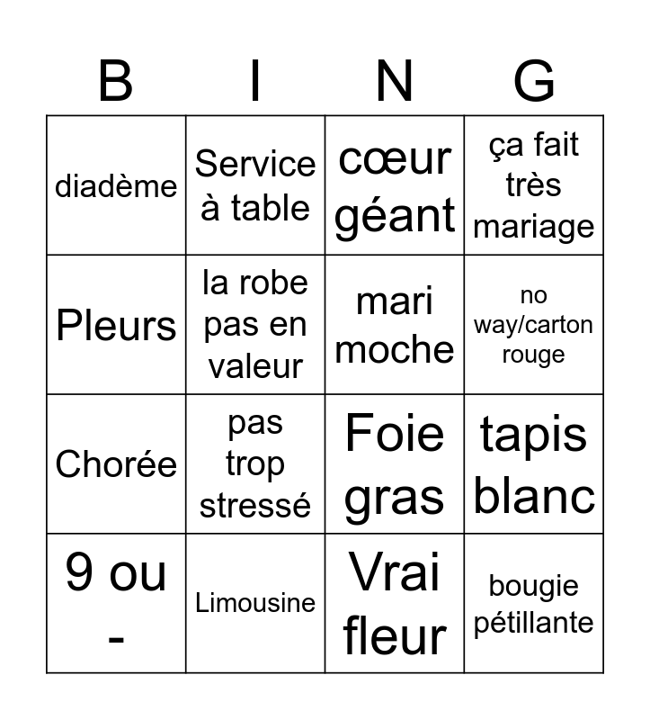This bingo card has 16 words: Limousine, tapis blanc, cœur géant, diadème, Chorée, Service à table, Foie gras, Vrai fleur, Pleurs, la robe pas en valeur, 9 ou -, ça fait très mariage, pas trop stressé, no way/carton rouge, mari moche and bougie pétillante.