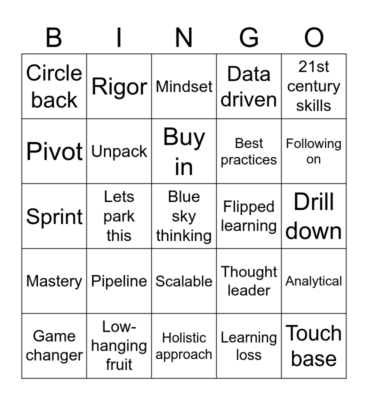 This bingo card has 54 words: Free!, Mastery, Mission statement, Cutting edge, Scalable, Value-add, Data driven, Robust, Pivot, Deep dive, Circle back, Disruptor, Low-hanging fruit, Game changer, Actionable, Holistic approach, Blue sky thinking, Best practices, Bandwidth, Drill down, Thought leader, Learning intention, Flipped learning, 21st century skills, Build relationships, Rigor, Growth mindset, Grit, Restorative, Learning loss, Differentiation, Standardised testing, Self care, Remember your why, Mindset, Strategic direction, Sprint, Analytical, Touch base, Unpack, Level up, Boots on the ground, Sync, Pushback, Pipeline, Loop in, Align, Take offline, Buy in, Lets park this, Following on, Brain dump, Silver bullet and ‘Any acronym’.
