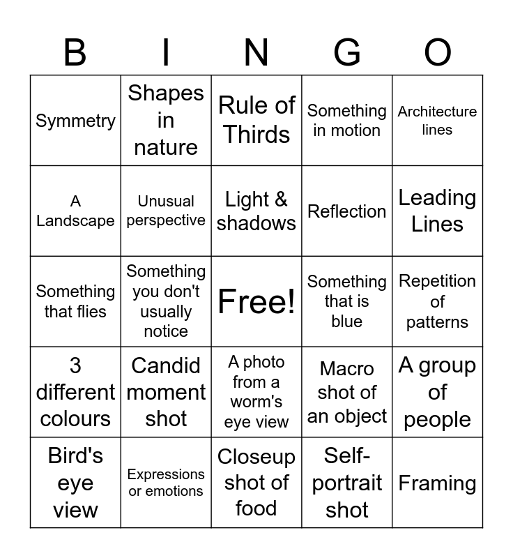 This bingo card has a free space and 24 words: Bird's eye view, Candid moment shot, Light & shadows, Self-portrait shot, Architecture lines, Symmetry, Shapes in nature, Rule of Thirds, Something that is blue, Repetition of patterns, Something that flies, Unusual perspective, Macro shot of an object, A group of people, A Landscape, Expressions or emotions, Closeup shot of food, Something in motion, Leading Lines, 3 different colours, Something you don't usually notice, A photo from a worm's eye view, Reflection and Framing.