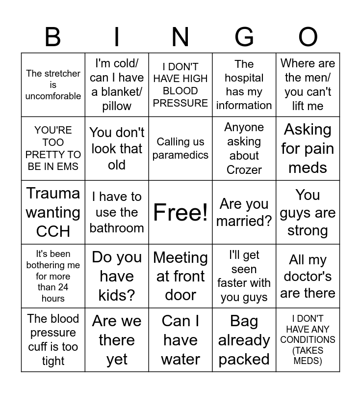 This bingo card has a free space and 24 words: Do you have kids?, Are we there yet, Calling us paramedics, The blood pressure cuff is too tight, Where are the men/ you can't lift me, The stretcher is uncomforable, YOU'RE TOO PRETTY TO BE IN EMS, I'm cold/ can I have a blanket/ pillow, Are you married?, Meeting at front door, Anyone asking about Crozer, Trauma wanting CCH, I'll get seen faster with you guys, All my doctor's are there, You don't look that old, Bag already packed, You guys are strong, I DON'T HAVE HIGH BLOOD PRESSURE, Asking for pain meds, I have to use the bathroom, I DON'T HAVE ANY CONDITIONS (TAKES MEDS), It's been bothering me for more than 24 hours, The hospital has my information and Can I have water.