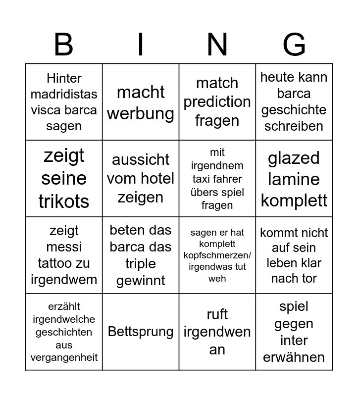 This bingo card has 16 words: Bettsprung, kommt nicht auf sein leben klar nach tor, match prediction fragen, Hinter madridistas visca barca sagen, zeigt messi tattoo zu irgendwem, macht werbung, sagen er hat komplett kopfschmerzen/ irgendwas tut weh, ruft irgendwen an, zeigt seine trikots, aussicht vom hotel zeigen, erzählt irgendwelche geschichten aus vergangenheit, heute kann barca geschichte schreiben, beten das barca das triple gewinnt, glazed lamine komplett, mit irgendnem taxi fahrer übers spiel fragen and spiel gegen inter erwähnen.