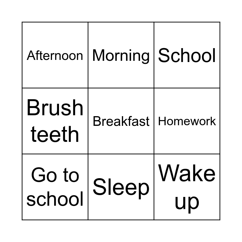 This bingo card has 11 words: Wake up, Sleep, Breakfast, Go to school, Morning, School, Homework, Work, Brush teeth, Afternoon and Evening.