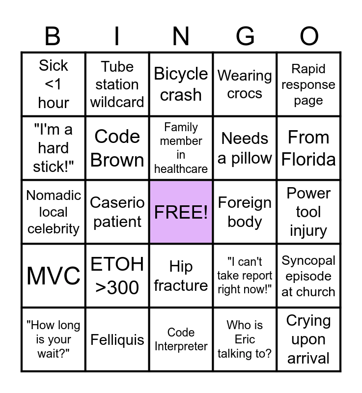 This bingo card has a free space and 24 words: ETOH >300, Felliquis, Family member in healthcare, "How long is your wait?", Rapid response page, Sick <1 hour, "I'm a hard stick!", Tube station wildcard, Foreign body, Hip fracture, Needs a pillow, Nomadic local celebrity, "I can't take report right now!", Syncopal episode at church, Code Brown, Who is Eric talking to?, Power tool injury, Bicycle crash, From Florida, Caserio patient, Crying upon arrival, MVC, Wearing crocs and Code Interpreter.