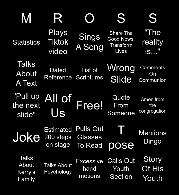 This bingo card has a free space and 45 words: "Give me the gift of preaching and teaching", Story Of His Youth, Talks About His Family, Talks About Kerry's Family, Calls Out A Member Of The Congregation, Calls Out Youth Section, Sings A Song, Walks Off Camera, "The reality is...", Talks About Psychology, Share The Good News, Transform Lives, Quote From Someone, Pulls Out Glasses To Read, Estimated 200 steps on stage, Tonal Shift, Excessive hand motions, Gets Political, "Pull up the next slide", Gets Congregation Rled Up, Comments On Communion, Plays Tiktok video, Deep breathe, long pause, Back in West Virginia, Statistics, Reference a book (not Bible), Amen from the congregation, Pull Out Your Bibles, Get Back To The Root Of Things, T pose, Joke, Calls Out An Elder or Elder's Wife, Mentions Bingo, Jesus Follower, Sports, Madison Church History, All of Us, The Goal is Jesus, I Saw This On FB, Movie Reference, List of Scriptures, Talks About A Text, Wrong Slide, Go!, Dated Reference and I Want To Encourage You.