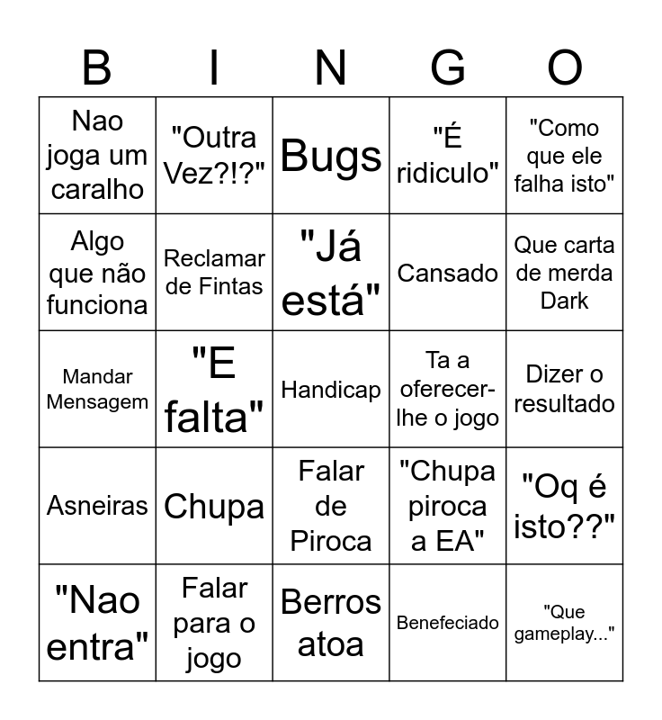 This bingo card has a free space and 29 words: "Nao entra", Filha da Puta do mouro, "E falta", Fds este jogo, Nao joga um caralho, Bugs, Reclamar de Fintas, Chupa, Ta a oferecer-lhe o jogo, Falar para o jogo, Dizer o resultado, "Que gameplay...", Berros atoa, Benefeciado, Que carta de merda Dark, Falar de Stats, Falar de Piroca, Asneiras, "Como que ele falha isto", Mandar Mensagem, "Chupa piroca a EA", Pay-to-Win, Cansado, Algo que não funciona, "É ridiculo", "Outra Vez?!?", "Oq é isto??", "Já está" and Reclamar da Carta.