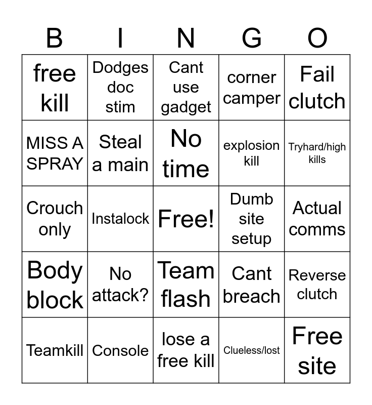 This bingo card has a free space and 32 words: Clueless/lost, 0 kills in halftime, Instalock, Rage/Voice chat, Body block, Steal a main, Fail clutch, Reverse clutch, Dodges doc stim, All roaming, No time, Cant use gadget, Baiting, 30 second round, Dumb site setup, AFK, Teamkill, Crouch only, Team flash, No attack?, Cant breach, Throwing, Actual comms, Console, Free site, corner camper, explosion kill, MISS A SPRAY, free kill, lose a free kill, Rat angle and Tryhard/high kills.
