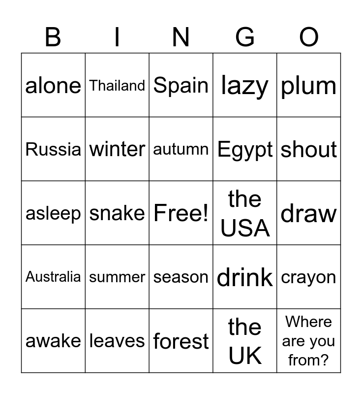 This bingo card has a free space and 28 words: crayon, spoon, Egypt, the UK, Russia, Spain, Thailand, Australia, the USA, awake, asleep, lazy, leaves, forest, shout, spring, summer, winter, autumn, season, alone, hungry, Where are you from?, snake, draw, drink, plum and Brazil.