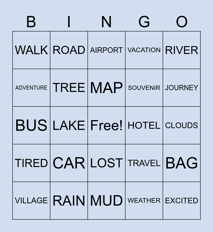 This bingo card has a free space and 24 words: CAR, RAIN, MAP, VILLAGE, RIVER, WALK, ADVENTURE, ROAD, HOTEL, LOST, SOUVENIR, BUS, TRAVEL, BAG, TREE, WEATHER, CLOUDS, AIRPORT, JOURNEY, LAKE, EXCITED, TIRED, VACATION and MUD.