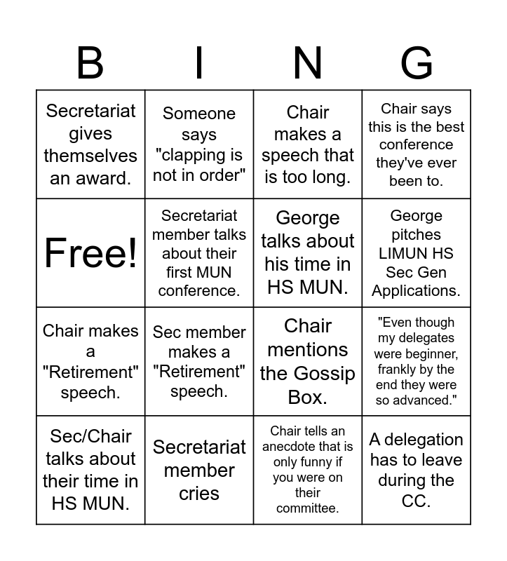 This bingo card has 16 words: Secretariat member cries, "Even though my delegates were beginner, frankly by the end they were so advanced.", Chair makes a speech that is too long., Secretariat gives themselves an award., Chair makes a "Retirement" speech., Someone says "clapping is not in order", Chair mentions the Gossip Box., Chair tells an anecdote that is only funny if you were on their committee., Free!, Secretariat member talks about their first MUN conference., Sec/Chair talks about their time in HS MUN., Chair says this is the best conference they've ever been to., Sec member makes a "Retirement" speech., George pitches LIMUN HS Sec Gen Applications., George talks about his time in HS MUN. and A delegation has to leave during the CC..