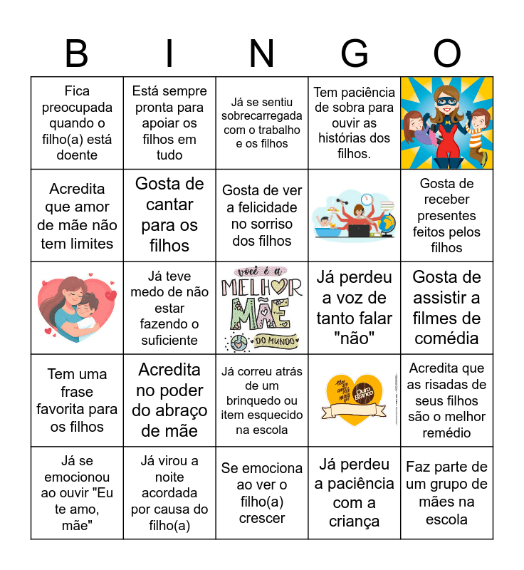 This bingo card has 4 images, a free space and 25 words: Já se emocionou ao ouvir "Eu te amo, mãe", Já acordou de madrugada por causa dos filhos, Já teve medo de não estar fazendo o suficiente, Sempre tem um conselho para dar, Fica preocupada quando o filho(a) está doente, Já se sentiu sobrecarregada com o trabalho e os filhos, Gosta de cantar para os filhos, Acredita no poder do abraço de mãe, Já perdeu a voz de tanto falar "não", Já virou a noite acordada por causa do filho(a), Gosta de assistir a filmes de comédia, Faz parte de um grupo de mães na escola, Se emociona ao ver o filho(a) crescer, Já perdeu a paciência com a criança, Gosta de receber presentes feitos pelos filhos, Se sente realizada ao ver o filho(a) feliz, Já correu atrás de um brinquedo ou item esquecido na escola, Tem uma frase favorita para os filhos, Mãe que arrasa, Acredita que amor de mãe não tem limites, Tem paciência de sobra para ouvir as histórias dos filhos., Está sempre pronta para apoiar os filhos em tudo, Acredita que as risadas de seus filhos são o melhor remédio, Gosta de ver a felicidade no sorriso dos filhos and Rainha da Casa.