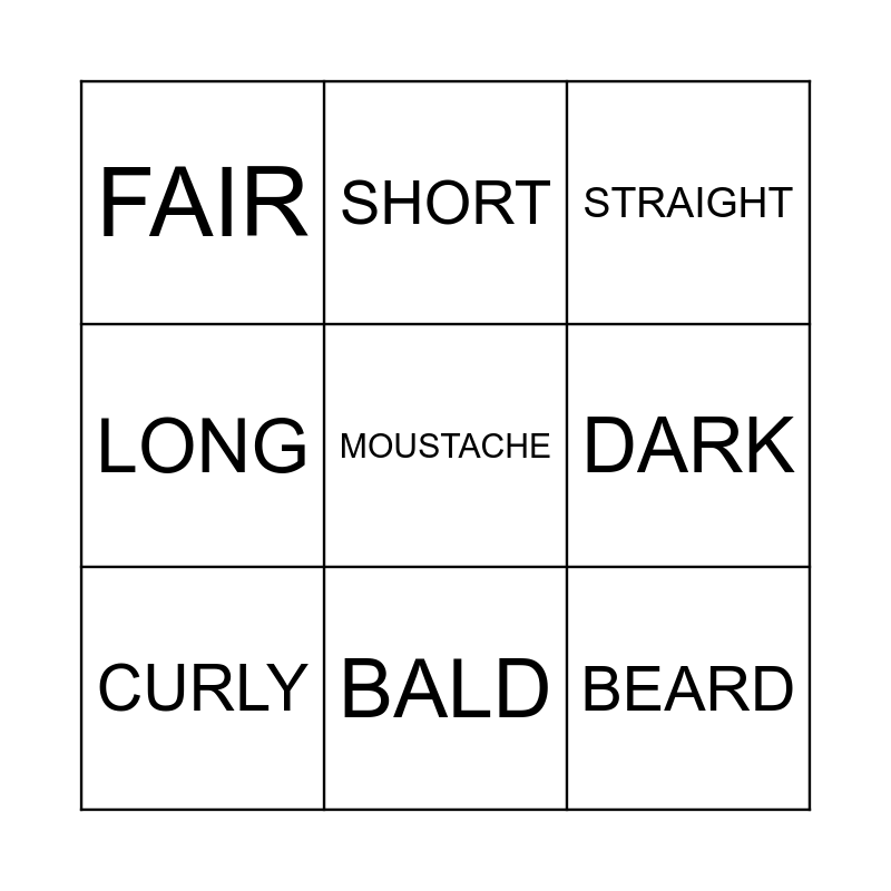 This bingo card has 9 words: CURLY, STRAIGHT, SHORT, LONG, FAIR, DARK, MOUSTACHE, BEARD and BALD.
