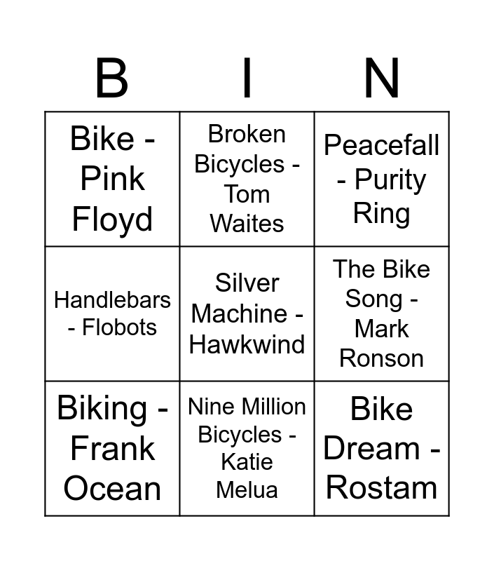 This bingo card has 26 words: Bicycle Race - Queen, Tour de France - Kraftwerk, Nine Million Bicycles - Katie Melua, My White Bicycle - Tomorrow, Silver Machine - Hawkwind, Bike - Pink Floyd, The Bike Song - Mark Ronson, Broken Bicycles - Tom Waites, Riding Bikes - The Flaming Lips, Happy Cycling - Boards of Canada, Bike Dream - Rostam, My Bike - Kimya Dawson, Always Like This - Bombay Bicycle Club, Power - Little Mix, Bicycle Built for Two - Daisy Bell, To The Guy Who Stole My Bike - The Dirty Nil, Handlebars - Flobots, Side to Side - Ariana Grande, Peacefall - Purity Ring, Cycling is Fun - Shonen Knife, Riding To New York- Passenger, Bicycle - Vybz Kartel, Bicycle - St Vincent, Bike Scene - Taking Back Sunday, Biking - Frank Ocean and Bike - Autechre.