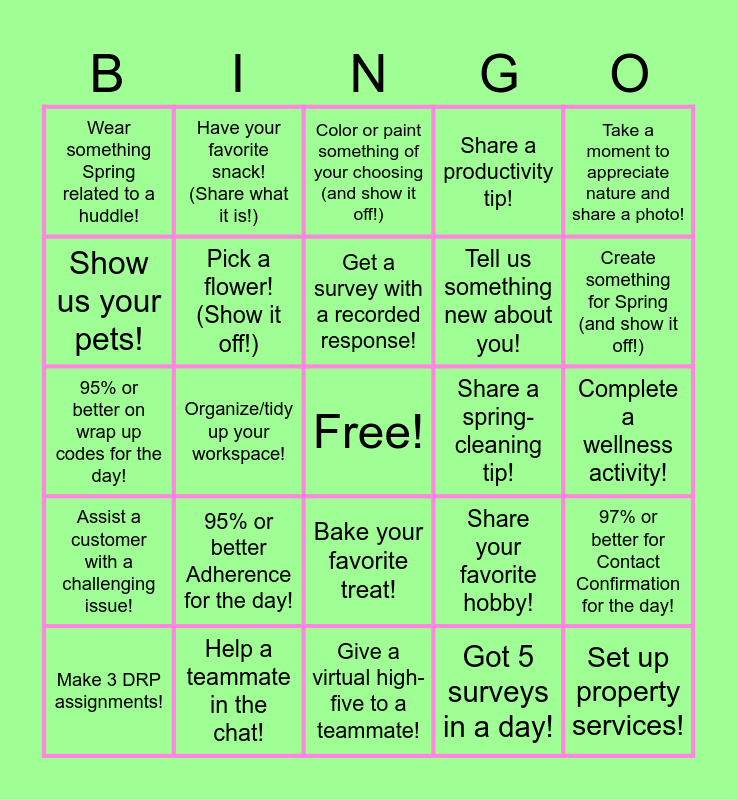 This bingo card has a free space and 25 words: Make 3 DRP assignments!, 95% or better Adherence for the day!, Get a survey with a recorded response!, Got 5 surveys in a day!, Create something for Spring (and show it off!), Wear something Spring related to a huddle!, Have your favorite snack! (Share what it is!), Color or paint something of your choosing (and show it off!), Tell us something new about you!, 97% or better for Contact Confirmation for the day!, 95% or better on wrap up codes for the day!, Pick a flower! (Show it off!), Share your favorite hobby!, Set up property services!, Show us your pets!, Help a teammate in the chat!, Give a virtual high-five to a teammate!, Share a productivity tip!, Complete a wellness activity!, Assist a customer with a challenging issue!, Organize/tidy up your workspace!, Bake your favorite treat!, Share a spring-cleaning tip!, Take a moment to appreciate nature and share a photo! and Give a shout-out to a teammate for their hard work!.
