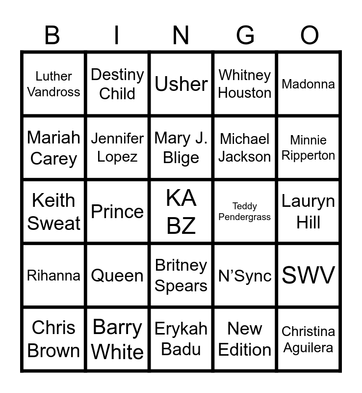 This bingo card has a free space and 24 words: Queen, Barry White, Mary J. Blige, Chris Brown, Madonna, Luther Vandross, Mariah Carey, Destiny Child, Teddy Pendergrass, Britney Spears, Michael Jackson, Keith Sweat, N’Sync, SWV, Jennifer Lopez, New Edition, Lauryn Hill, Usher, Minnie Ripperton, Prince, Christina Aguilera, Rihanna, Whitney Houston and Erykah Badu.