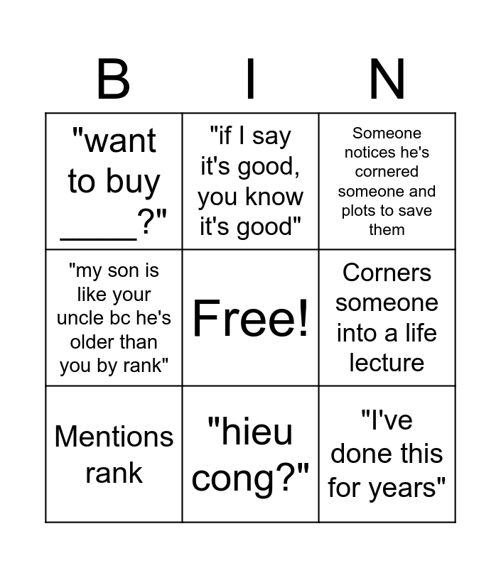 This bingo card has a free space and 8 words: Corners someone into a life lecture, Someone notices he's cornered someone and plots to save them, "if I say it's good, you know it's good", Mentions rank, "want to buy ____?", "I've done this for years", "my son is like your uncle bc he's older than you by rank" and "hieu cong?".