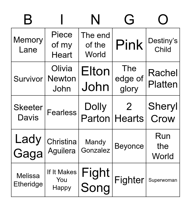 This bingo card has a free space and 33 words: Alicia Keys, Carly Simon, Fearless, Candy Coburn, Lady Gaga, Olivia Newton John, Destiny’s Child, Melissa Etheridge, Piece of my Heart, Anticipation, Elton John, The end of the World, Kylie Minogue, Minnie Riperton, 2 Hearts, Rachel Platten, If It Makes You Happy, Skeeter Davis, Christina Aguilera, Beyonce, Mandy Gonzalez, Live On, Memory Lane, Sheryl Crow, Fight Song, Superwoman, Pink, The edge of glory, Survivor, Run the World, Im still Standing, Fighter and Pink Warrior.