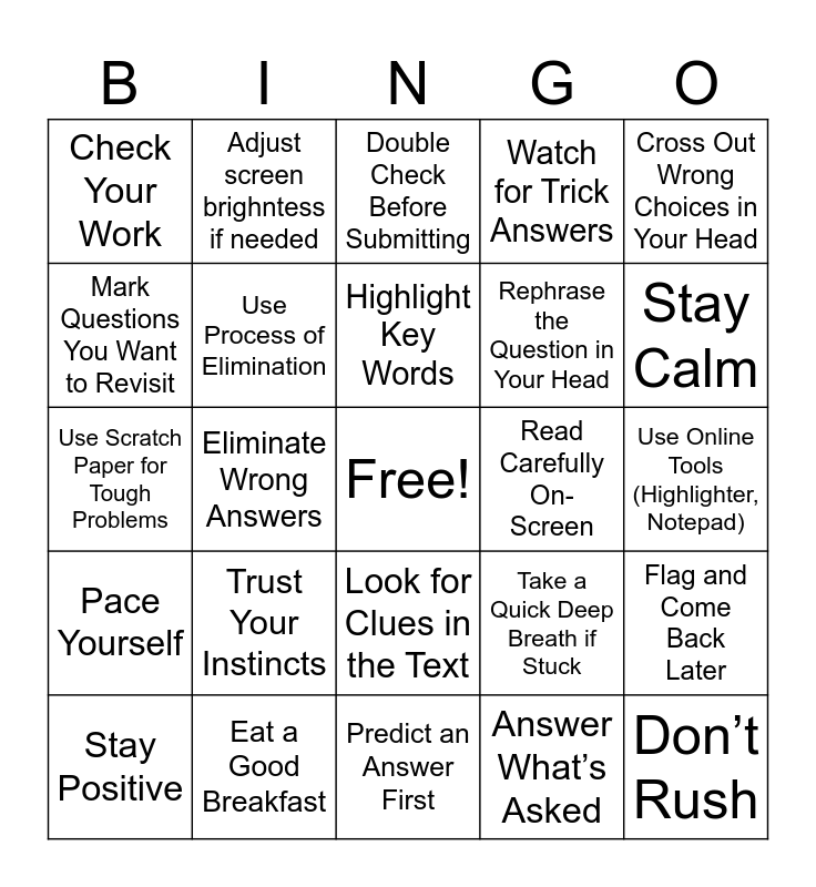 This bingo card has a free space and 29 words: Stay Positive, Read All Directions, Eliminate Wrong Answers, Reread the Question, Check Your Work, Double Check Before Submitting, Use Process of Elimination, Trust Your Instincts, Read Carefully On-Screen, Eat a Good Breakfast, Use Online Tools (Highlighter, Notepad), Don’t Rush, Predict an Answer First, Answer What’s Asked, Stay Calm, Check Multiple Choice Carefully, Look for Clues in the Text, Pace Yourself, Cross Out Wrong Choices in Your Head, Use Scratch Paper for Tough Problems, Take a Quick Deep Breath if Stuck, Zoom In/Out on Screen if Needed, Rephrase the Question in Your Head, Mark Questions You Want to Revisit, Watch for Trick Answers, Adjust screen brighntess if needed, Flag and Come Back Later, Highlight Key Words and Use All Your Time.