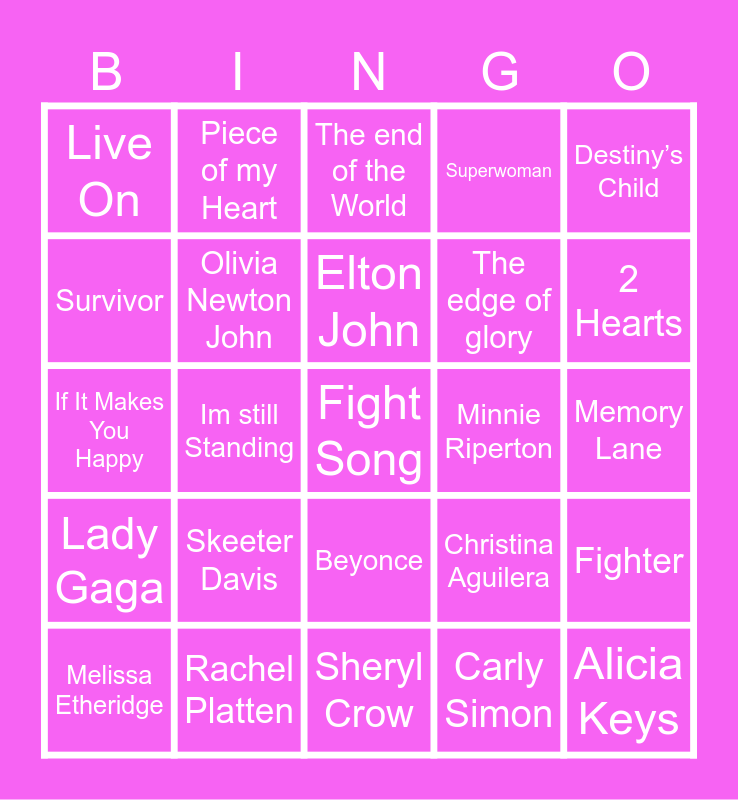 This bingo card has 34 words: Alicia Keys, Carly Simon, Fearless, Candy Coburn, Lady Gaga, Olivia Newton John, Destiny’s Child, Melissa Etheridge, Piece of my Heart, Anticipation, Elton John, The end of the World, Dolly Parton, Kylie Minogue, Minnie Riperton, 2 Hearts, Rachel Platten, If It Makes You Happy, Skeeter Davis, Christina Aguilera, Beyonce, Mandy Gonzalez, Live On, Memory Lane, Sheryl Crow, Fight Song, Superwoman, Pink, The edge of glory, Survivor, Run the World, Im still Standing, Fighter and Pink Warrior.