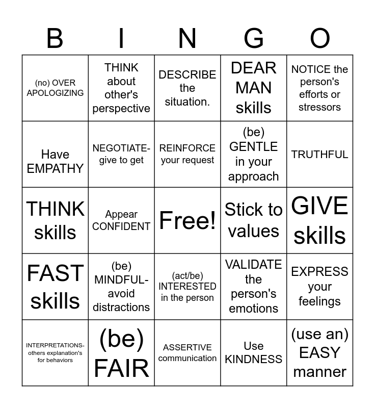 This bingo card has a free space and 24 words: (be) MINDFUL- avoid distractions, (be) FAIR, REINFORCE your request, INTERPRETATIONS- others explanation's for behaviors, NOTICE the person's efforts or stressors, (no) OVER APOLOGIZING, Have EMPATHY, THINK about other's perspective, Stick to values, (act/be) INTERESTED in the person, (be) GENTLE in your approach, THINK skills, VALIDATE the person's emotions, EXPRESS your feelings, NEGOTIATE- give to get, Use KINDNESS, GIVE skills, DESCRIBE the situation., TRUTHFUL, Appear CONFIDENT, (use an) EASY manner, FAST skills, DEAR MAN skills and ASSERTIVE communication.