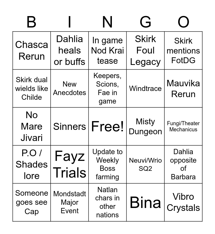 This bingo card has a free space and 29 words: Someone goes see Cap, Harbinger comes to Natlan, Sinners, Mualani Rerun, Chasca Rerun, In game Nod Krai tease, New Anecdotes, Fayz Trials, Misty Dungeon, Mondstadt Major Event, Fungi/Theater Mechanicus, Vibro Crystals, Natlan chars in other nations, Bina, Mauvika Rerun, Improved Enemy Tracker, Update to Weekly Boss farming, P.O / Shades lore, Skirk mentions FotDG, No Mare Jivari, Neuvi/Wrio SQ2, Sumeru/Fontaine Drink a Dreamin, Windtrace, Skirk dual wields like Childe, Skirk Foul Legacy, Dahlia heals or buffs, Dahlia opposite of Barbara, Keepers, Scions, Fae in game and Divine Inguinity.
