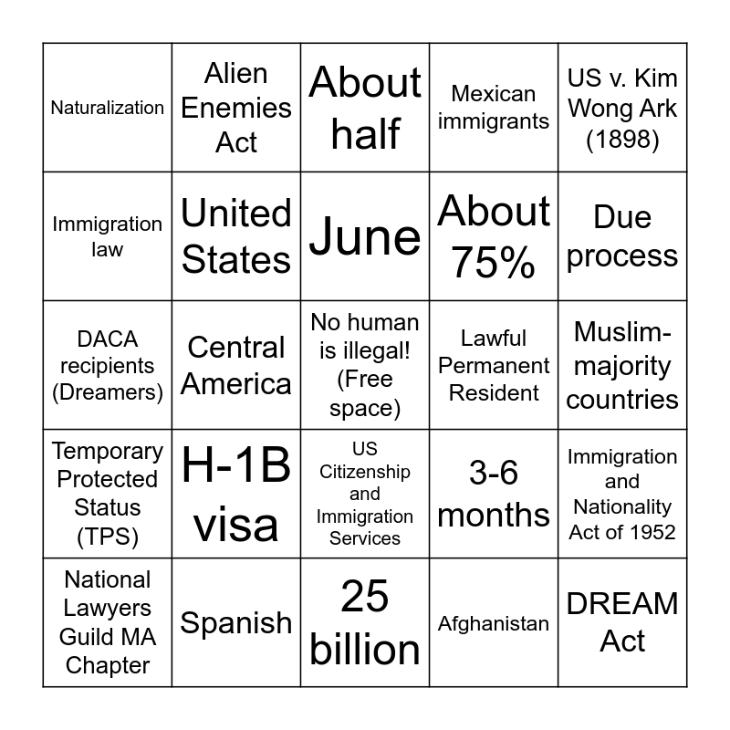 This bingo card has a free space and 40 words: 1892, DACA recipients (Dreamers), Chinese Exclusion Act of 1882, United States, Spanish, US Citizenship and Immigration Services, June, Refugee or asylee, US v. Kim Wong Ark (1898), Temporary Protected Status (TPS), Central America, Mexican immigrants, DREAM Act, Muslim-majority countries, Lawful Permanent Resident, H-1B visa, Sanctuary city, Naturalization, 4 years, About half, Immigration and Nationality Act of 1952, Afghanistan, About 75%, Immigration law, Positive, About 14%, 5 years, F-1 visa, 2002, 6th, United Nations High Commissioner for Refugees, National Lawyers Guild MA Chapter, San Ysidro, 3-6 months, Due process, 25 billion, Welfare and social security, 96 billion, Alien Enemies Act and China.