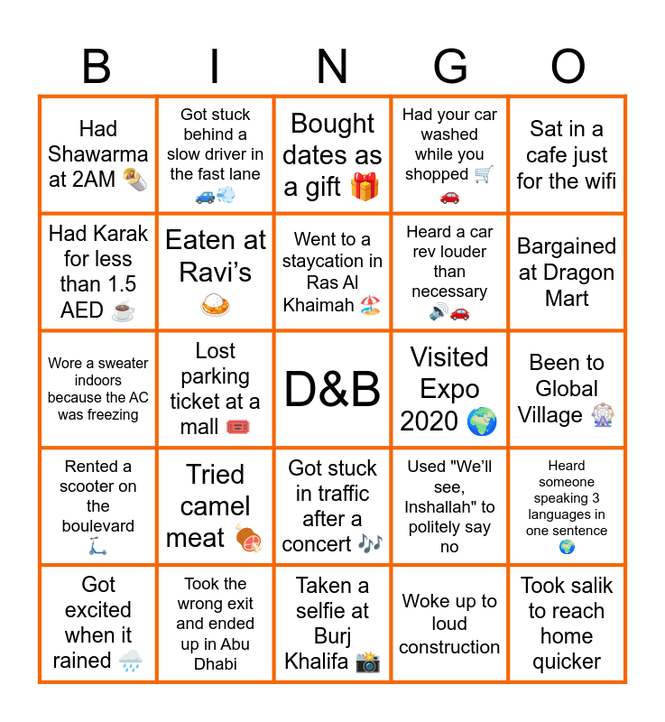 This bingo card has a free space and 29 words: Got excited when it rained π§οΈ, Woke up early for a Dubai Fitness Challenge πββοΈ, Lost parking ticket at a mall ποΈ, Used Entertainer app for a deal π±, Had Shawarma at 2AM π―, Bought dates as a gift π, Eaten at Raviβs π, Tried camel meat π, Visited Expo 2020 π, Took the wrong exit and ended up in Abu Dhabi, Been to Global Village π‘, Took salik to reach home quicker, Taken a selfie at Burj Khalifa πΈ, Woke up to loud construction, Bargained at Dragon Mart, Witnessed a sandstorm π¬οΈ, Got stuck in traffic after a concert πΆ, Rented a scooter on the boulevard π΄, Sat in a cafe just for the wifi, Wore a sweater indoors because the AC was freezing, Used "Weβll see, Inshallah" to politely say no, Went to Kite Beach only to find no parking, Heard a car rev louder than necessary ππ, Had Karak for less than 1.5 AED β, Had your car washed while you shopped ππ, Got stuck behind a slow driver in the fast lane ππ¨, Heard someone speaking 3 languages in one sentence π, Went to a staycation in Ras Al Khaimah ποΈ and Paid extra for "special toppings" on a burger π.
